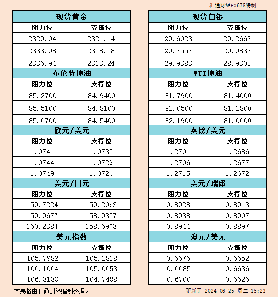 汇通财经APP讯——本文提供黄金、白银、原油、美元指数、欧元、英镑、日元、瑞郎、澳元支撑阻力位。
