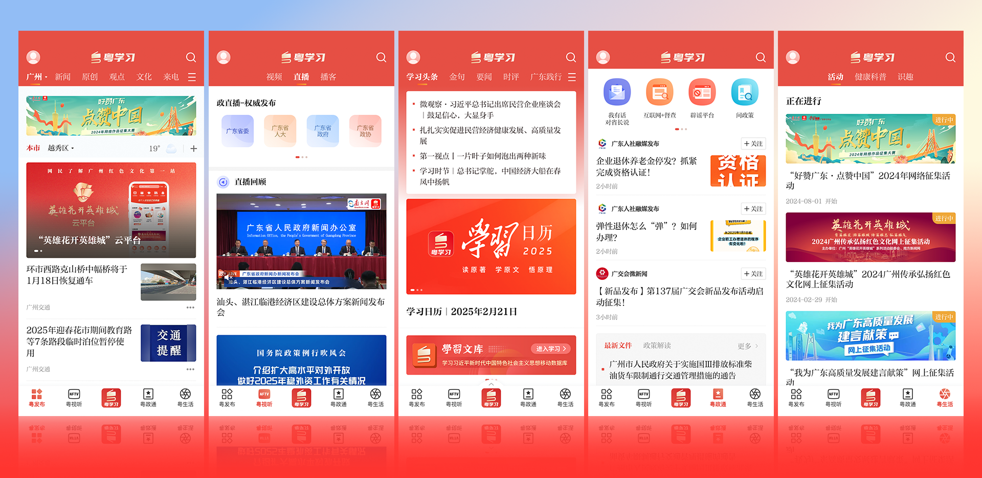 其中,“粤学习”全面集纳中央和广东省主要媒体关于习近平新时代中国特色社会主义思想的各类新闻报道和理论阐释文章;“粤政通”在最新版本进行了政务新媒体数智化升级,构建智能政务栏目矩阵,打造全场景交互式政策解读平台,推出个性化政务订阅服务,网民可定制垂直领域政务信息流并实时获取更新提醒,同步搭载十余项便民应用,提供贴心“指尖政务”服务;“粤视听”汇聚中央主要媒体、广东省内重要视频内容及政务直播,打造南方TV、政直播等品牌,开设“阿峰讲good”等多个特色播客栏目;“粤生活”开设活动、健康科普、识趣等多个栏目,鼓励网民积极分享美好生活;“粤发布”地市频道聚合21个地市、100多个县区镇街及700多个公众号、头条号、网站等的内容,构成“1+21+N”地市矩阵,根据定位发布覆盖198个地市县区镇街的实时、实用民生服务信息,包括最新政策、社区活动、交通路况等,集地区资讯定制、活动运营、服务应用于一身,满足网民个性化阅读需求。